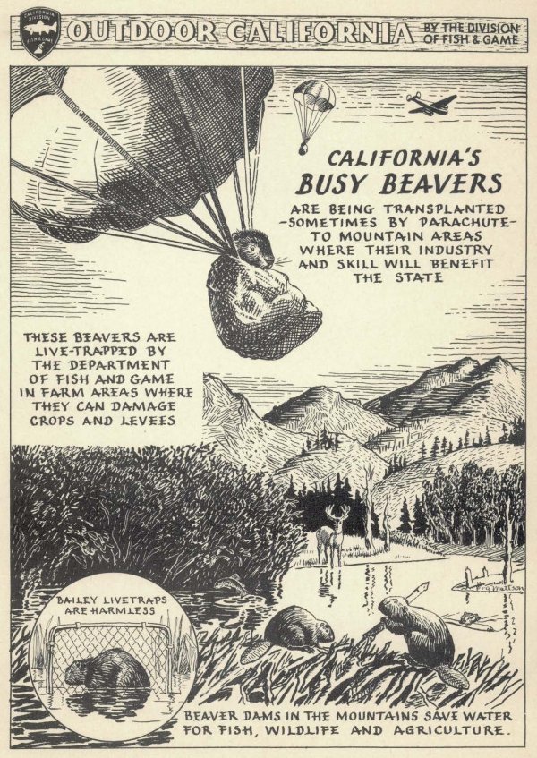 In response, a total of 1,221 beaver were live-trapped and delivered to watersheds across the state, and were even dropped from airplanes into the El Dorado National Forest using boxes with parachutes attached! Some of our beaver colonies today descend from those transplanted during translocation programs.